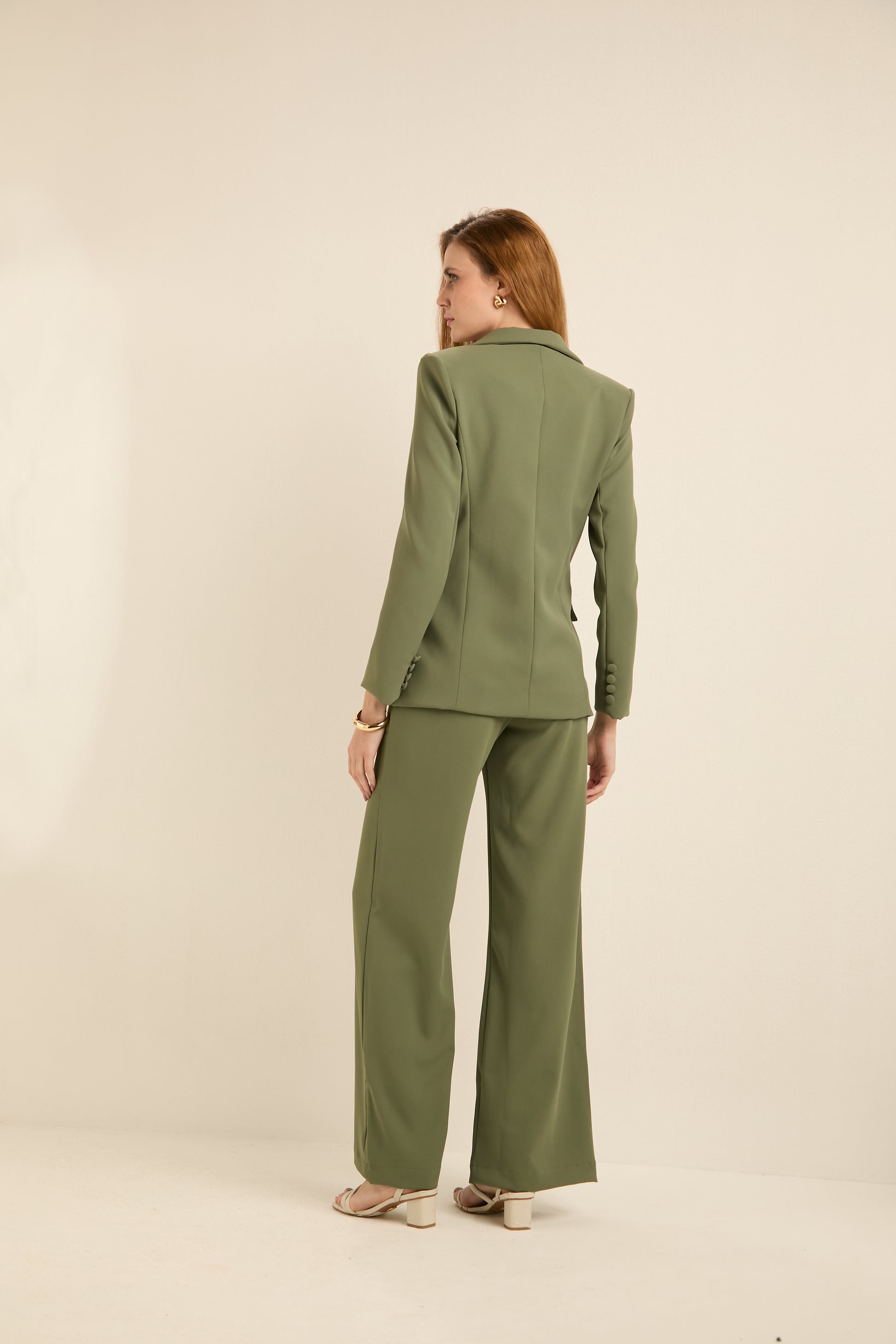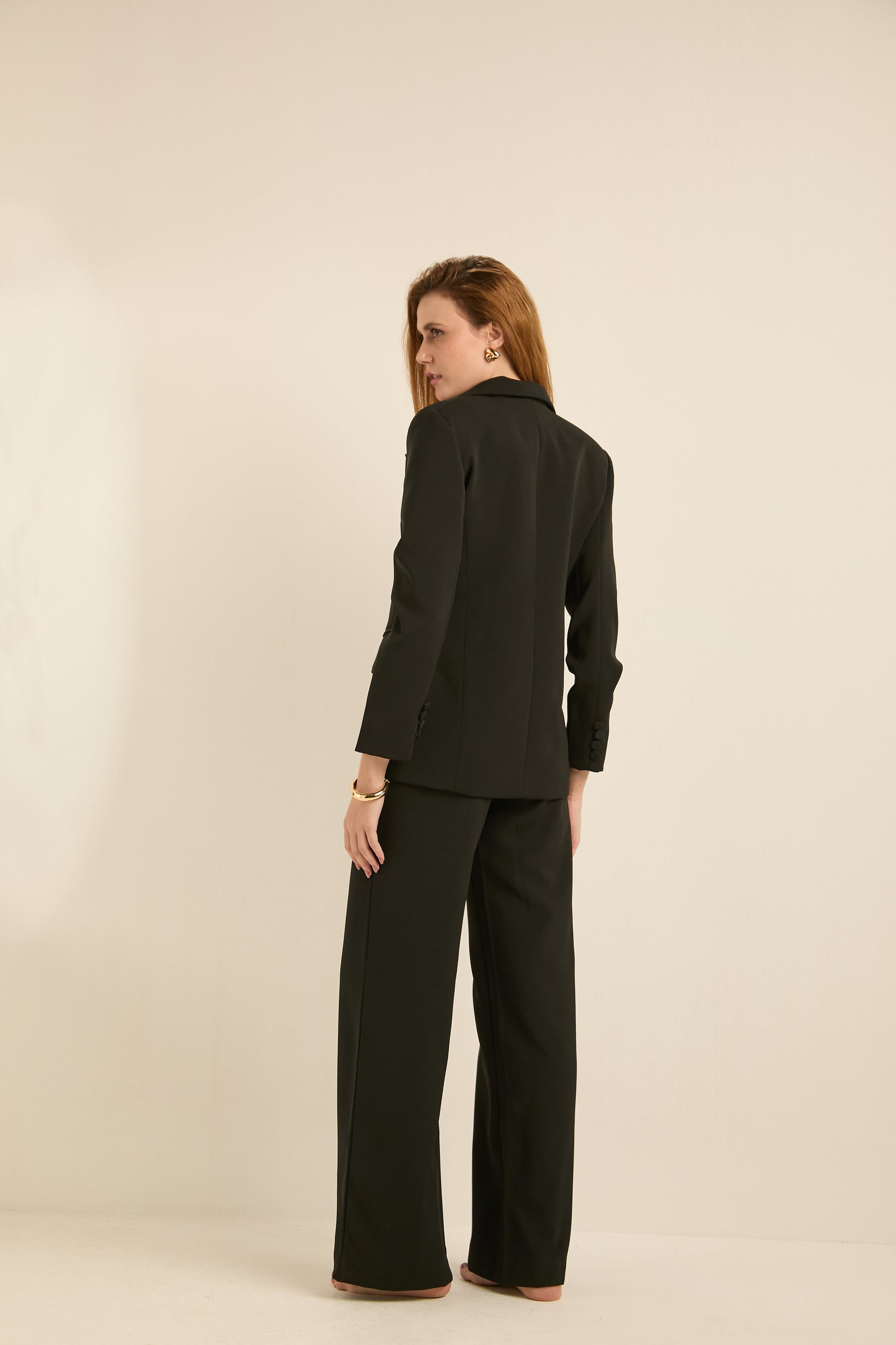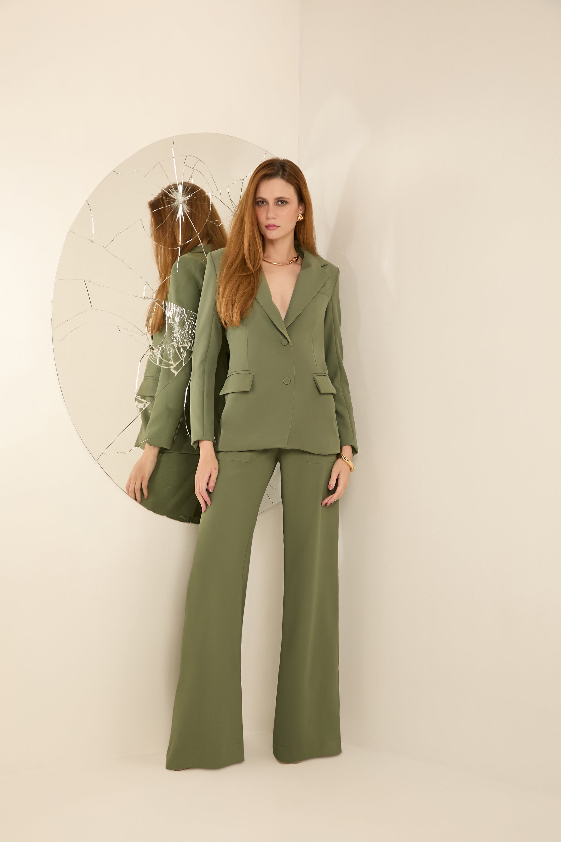 Calça pantalona confeccionada em crepe, com modelagem de alfaiataria, cós com passantes duplos frente e costas, fechamento por ziper e colchetes frontais com braguilha. Possui bolsos faca chapados, pespontados por fora da peça.