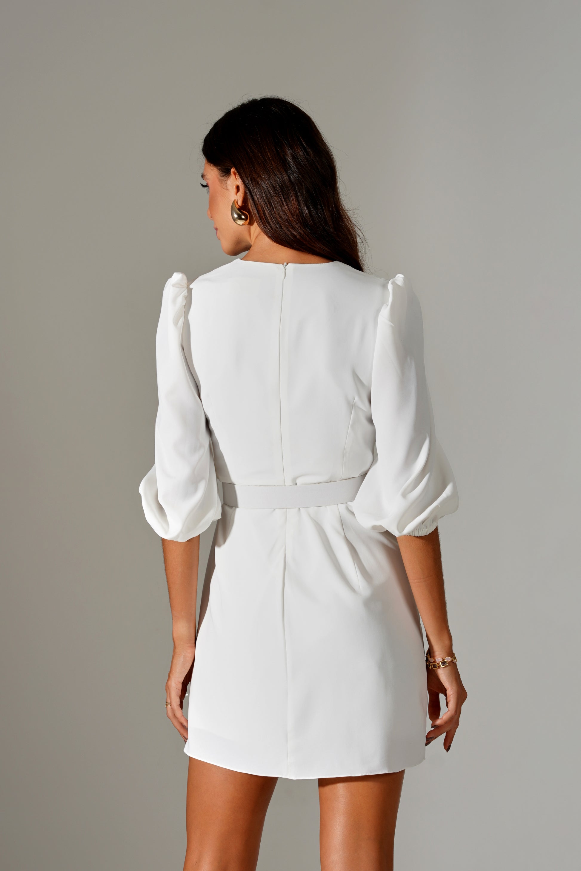 Macaquinho em crepe leve, com franzidos na frente e detalhe arredondado no meio;