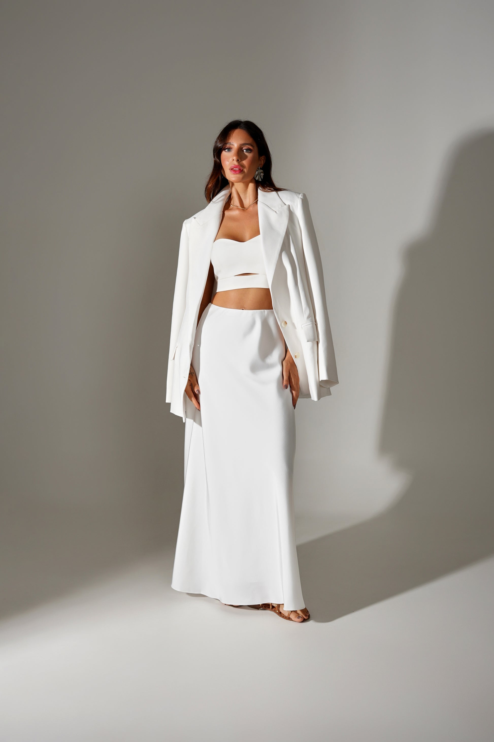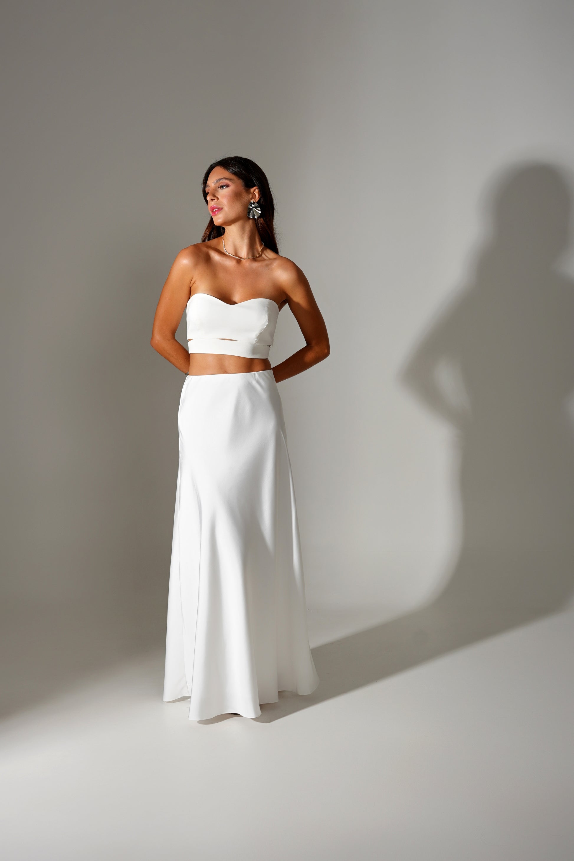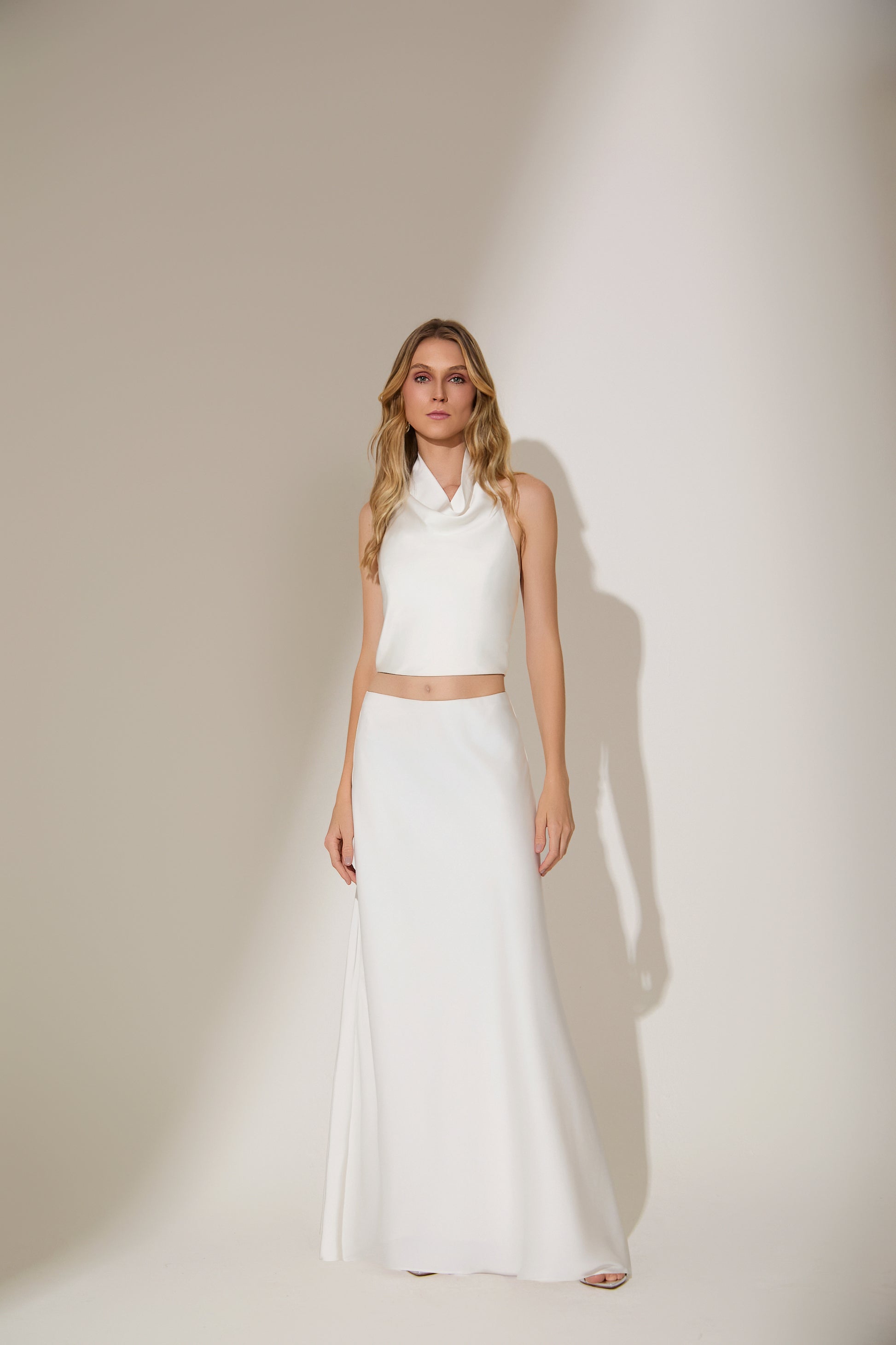 Saia sereia longa de cetim, cortada no viés. Possui corte que alonga a silhueta, garantindo elegância ao look.