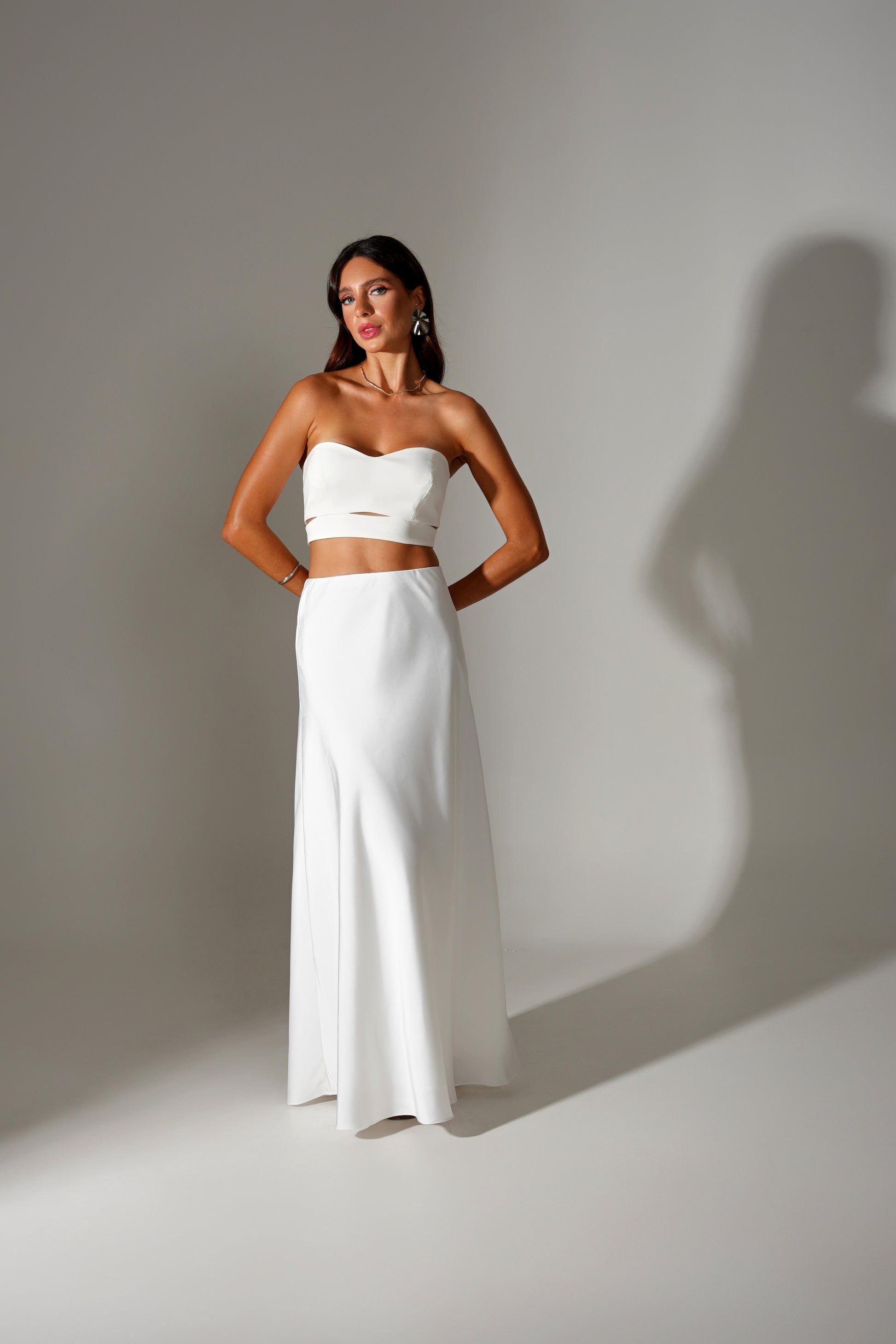 Top croped com recortes em crepe de alfaiataria, com lastéx e zíper nas costas. Decote coração.