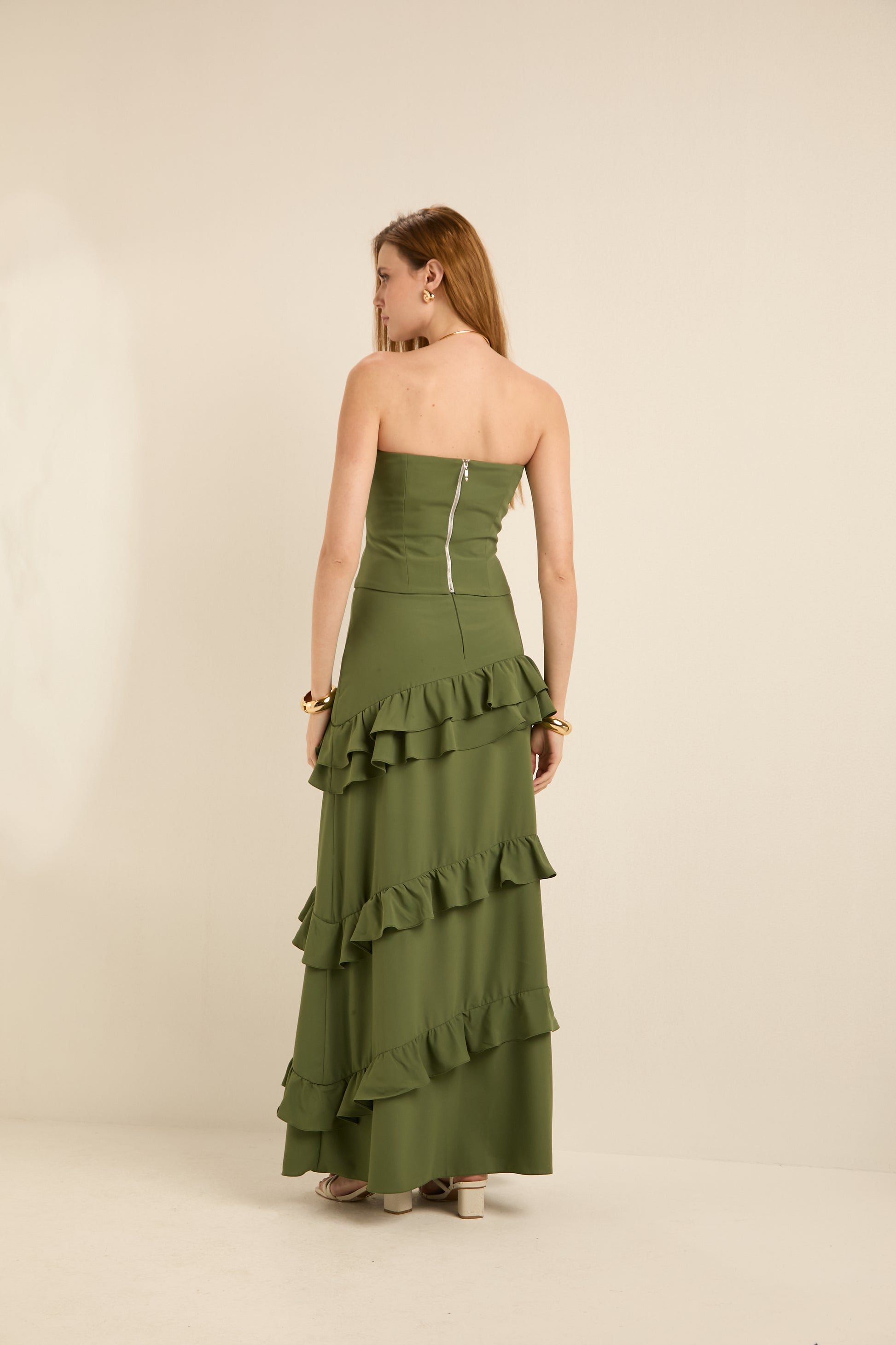 Corset estruturada por barbatanas, decote reto tomara que caia, feito em crepe com toque levemente aveludado. Sua estrutura modela o corpo feminino, valorizando sua silhueta. Possui zíper de metal destacável nas costas, garantindo praticidade e conforto.