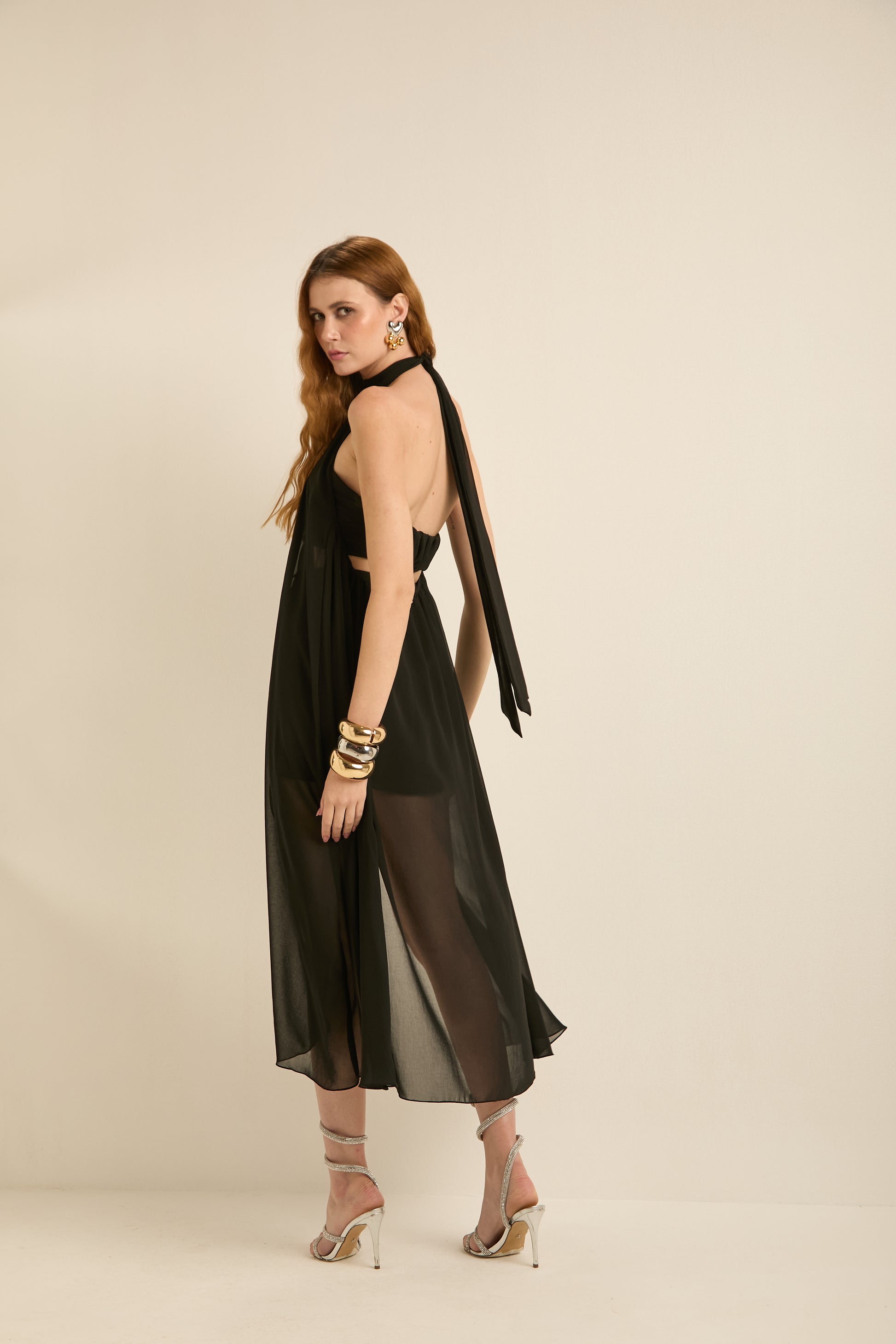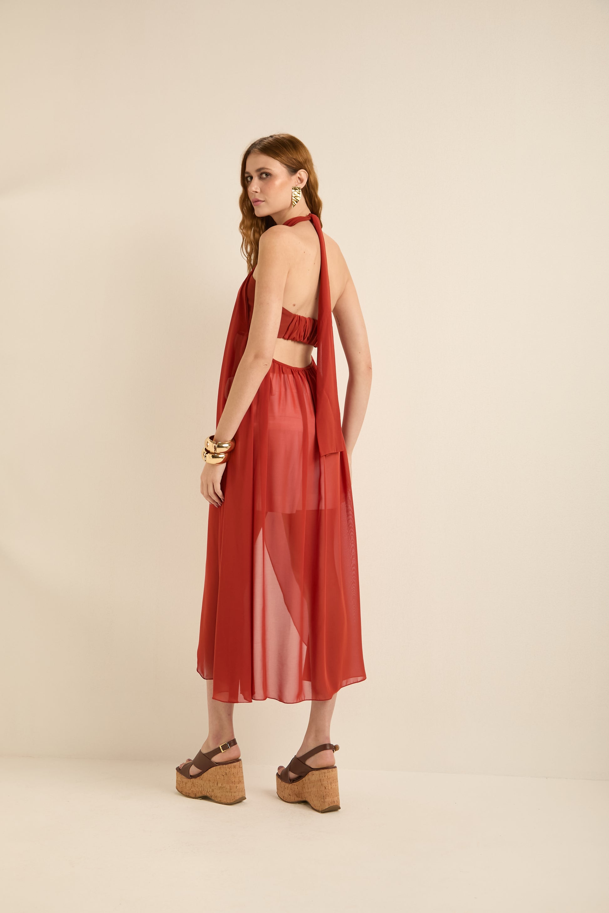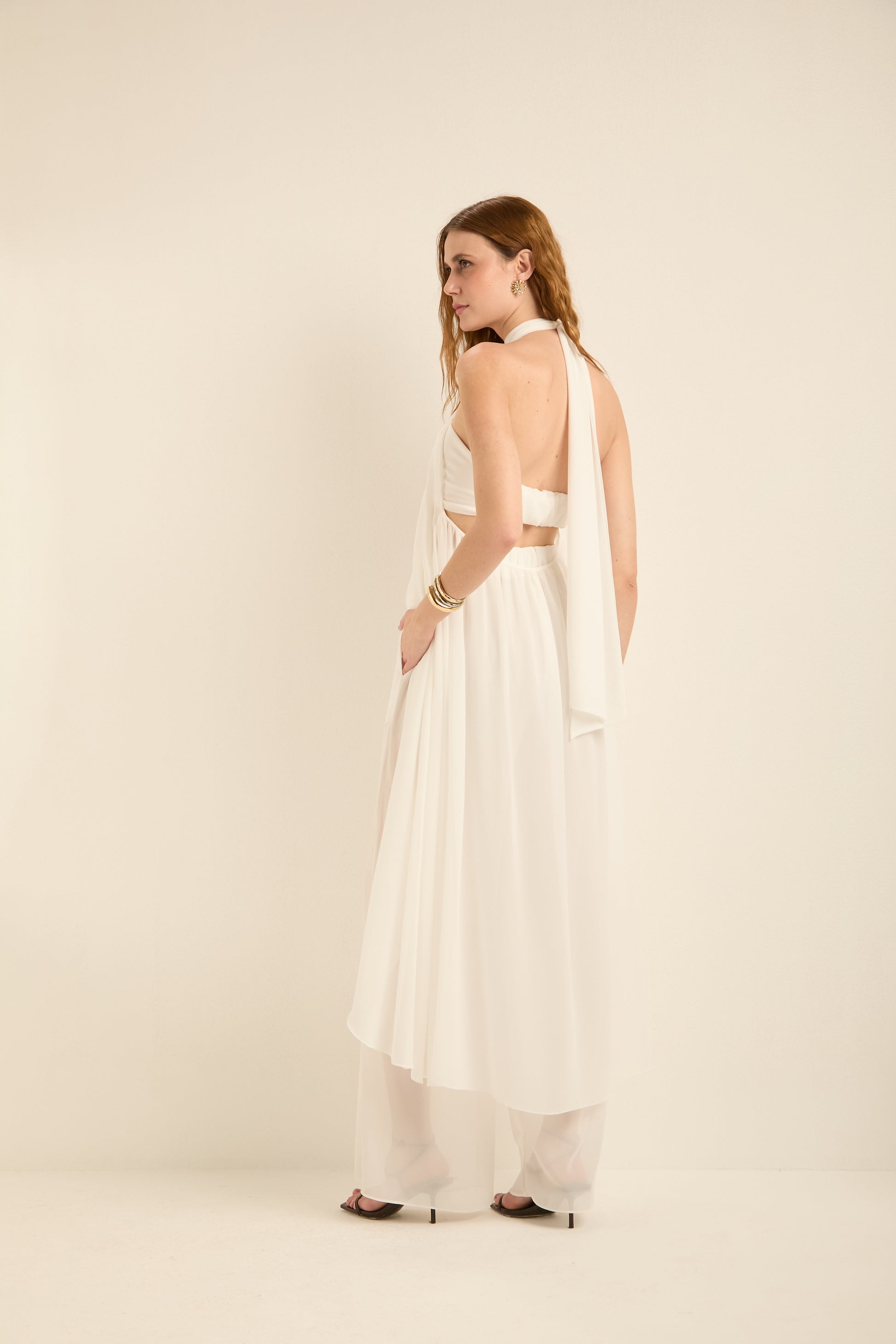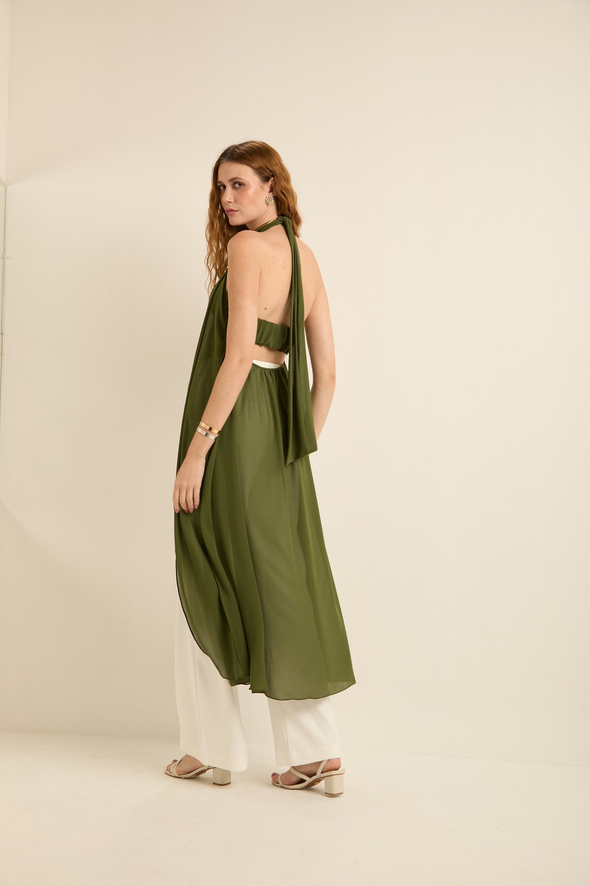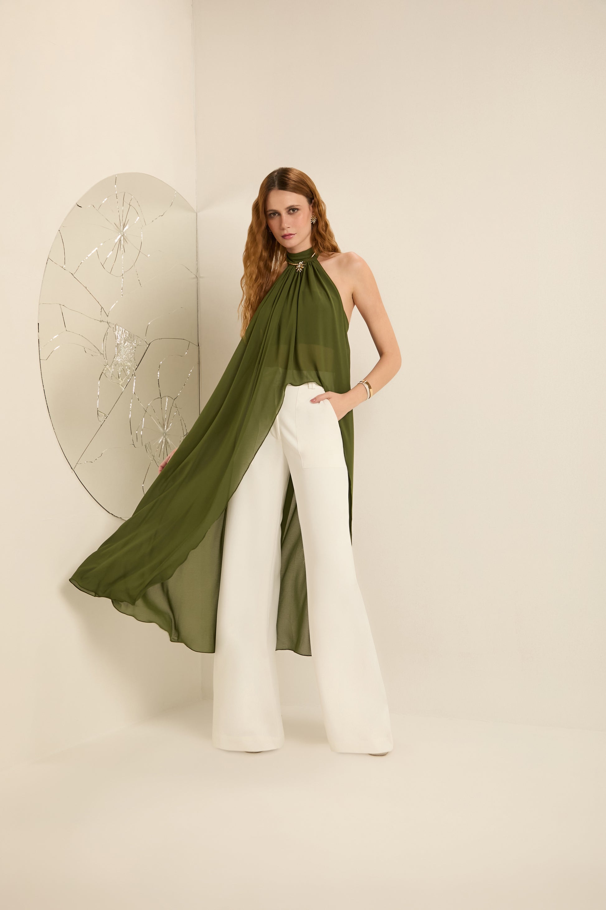 A Túnica Eloá é confeccionada em musseline, um tecido leve e fluido que proporciona um caimento suave e sofisticado, a peça traz modelagem frente única com delicados franzidos na parte frontal e amarração no pescoço. Acompanha um top no mesmo tecido, com elástico nas costas, garantindo conforto e liberdade de movimento sem abrir mão do estilo. Seu design assimétrico, com uma lateral levemente mais curta, cria um efeito orgânico e moderno que torna a peça única e cheia de personalidade. Ideal para produções versáteis que transitem entre o casual refinado e o elegante descontraído.