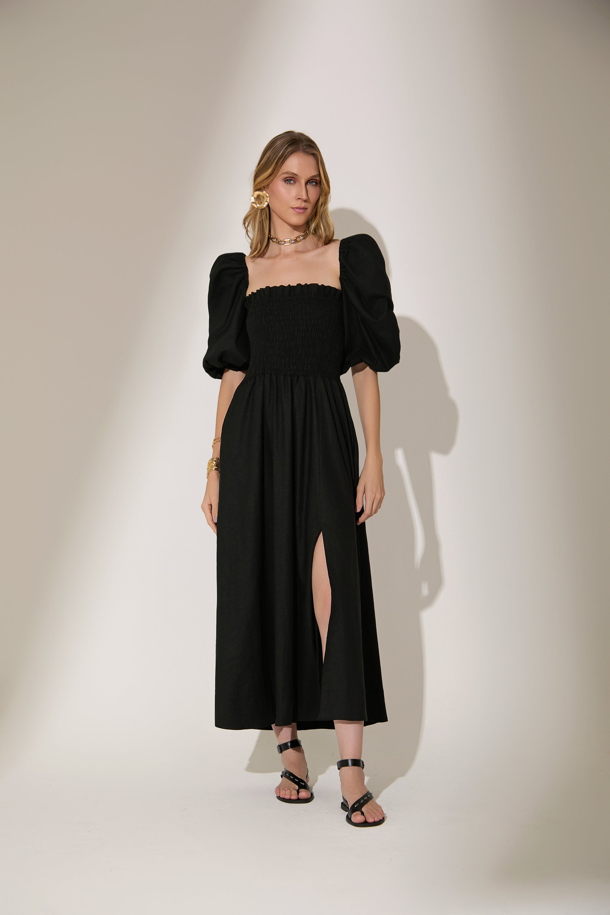 Vestido longo feminino em linho com design sofisticado e versátil. Possui um charmoso corpete com elástico que se ajusta perfeitamente ao corpo, mangas bufantes removíveis que oferecem duas opções de uso e uma abertura frontal que confere movimento e estilo. Ideal para eventos casuais ou ocasiões especiais, este vestido une conforto e elegância. Combine com sandálias delicadas para um visual leve ou acessórios dourados para um toque glamoroso. Perfeito para mulheres que buscam estilo e funcionalidade em uma única peça.